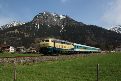 Der Intercity 2085 Hamburg > Oberstdorf fährt mit seinen 5 Wagen und der vorgespannten BR218 aus Altstädten hinaus um dem Zielbahnhof Oberstdorf entgegenzufahren.